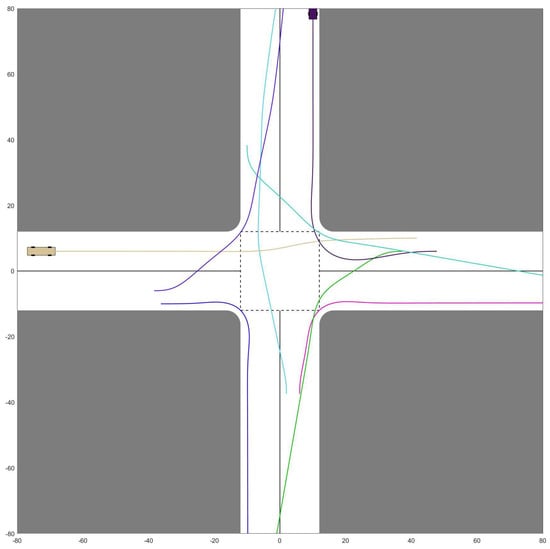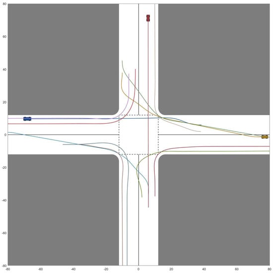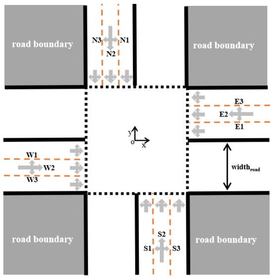 The setting under examination is an intersection devoid of any signaling system or pre-defined lane structure. In this environment, CAVs possess the flexibility to proceed straight ahead, make a left turn, or steer right, anywhere within the intersection’s confines. These vehicles are delineated with distinctive identifiers ranging from N1 to E3. The combination of alphabets and numerals in these identifiers signifies the direction from which a CAV approaches the intersection and its subsequent exit path, as illustrated in