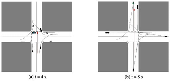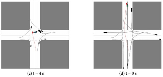 Upon analyzing the yielded results, it is evident that in juxtaposition to Algorithm 1**, our method enables the emergency CAV to surpass No. 1 and No. 2 CAVs at the 4 s and 8 s marks, respectively, securing its precedence in exiting the intersection from the north. This illustrates the nuanced efficiency of our approach, where emergency CAVs, due to their velocity primacy, can navigate swiftly, contributing to the preservation of a harmonious and organized traffic flow. Such structured preferential treatment not only enhances road traffic stability but also prioritizes urgency, reflecting a more intuitive and adaptive response to real-world traffic dynamics. This implementation signifies the integration of optimal functionality with rational responsiveness, aiming to create a harmonious coexistence of varying vehicle types and priorities within the intricate tapestry of urban traffic.