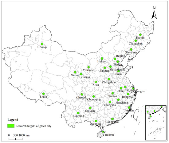 This study takes 31 major cities in China as samples, which include 4 municipalities directly under the central government, the provincial capitals or capitals of provinces and autonomous regions. The economic and social development level of these cities is at a relatively high level, and they are the main net inflow cities with a total population of over 320 million, nearly a quarter of the national level, which can basically represent the overall level of green city construction in China (Figure 1). Based on data from the China Statistical Yearbook 2021, China Urban Statistical Yearbook 2021, China Energy Statistical Yearbook 2021, China Environmental Statistical Yearbook 2021, China Urban Construction Statistical Yearbook 2021, National Science and Technology Investment Statistical Bulletin 2021, China Education Expenditure Statistical Yearbook 2021, as well as cities’ 2021 National Economic and Social Development Statistical Bulletin and Ecological Environment Quality Bulletin, etc., we summarized and analyzed the data of 31 samples.
