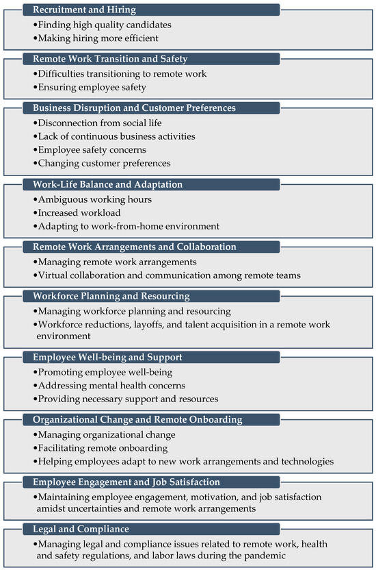| Kottaridi and Antoniadis [98] | 2021 | Managing legal and compliance issues related to remote work, health and safety regulations, and labor laws during the pandemic |