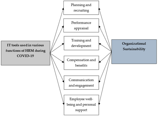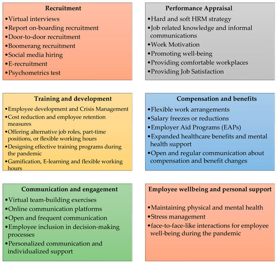 - During COVID-19: The HR strategies adapted during COVID-19 by the organizations for effective human resource management was studied by several authors. The authors of [130] examined the crisis management, and 6Cs concept (compensation, caring culture, creativity, collaboration and coordination, clean/hygiene and communication) was adapted as an HR practice during COVID-19. The study by [131] concluded that adapting to new changes during the pandemic initially caused a denial of changes that affected the physical and psychological stability of employees. However, with the assistance of IS and IT tools, employees accepted the changes which, in turn, increased their productivity and performance. The authors of [132] examined and concluded that good HRM and HR practices (adopting IT tools and IS) positively impacted the organizational sustainability globally, whereas the bad HRM and HR practices failed to sustain. The authors of [133] insisted that COVID-19 altered the organizational functions and operations. According to the author, the challenges faced by the HR personnel in staffing, training and development, monitoring and guiding, performance appraisals, benefits, compensation, health and safety management (well-being), employee–employer relationships and recruiting and planning for virtual teams affected the organizational sustainability. However, it was concluded that positive HRM strategies during COVID-19 increased the organizational productivity, which had an indirect association with the employees’ performances, motivation, mental well-being, productivity and satisfaction.