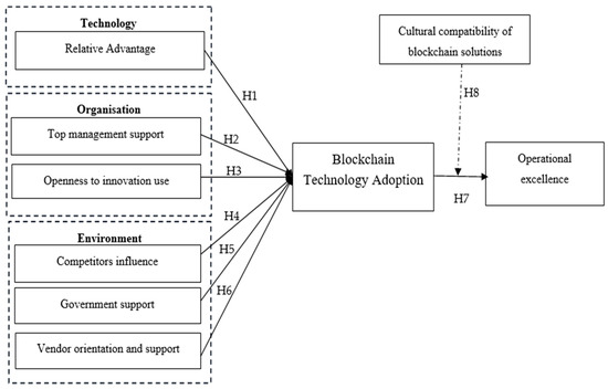 8. Malik, S.; Chadhar, M.; Vatanasakdakul, S.; Chetty, M. Factors affecting the organizational adoption of blockchain technology: Extending the technology–organization–environment (TOE) framework in the Australian context. Sustainability 2021, 13, 9404. [Google Scholar] [CrossRef]
