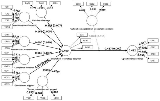 There are several justifications and arguments to support hypothesis H6, which states that the adoption of blockchain technology has a significant and positive impact on operational excellence in the Saudi supply chain and logistics sector. The ability of blockchain technology to offer unmatched transparency and traceability within supply chains is one of its main advantages. By way of illustration, Kayikci et al. [49] highlighted how blockchain technology promotes operational excellence, particularly in perishable food supply chains during outbreaks. The adoption of blockchain technology in organizations is directly linked to achieving operational excellence, enhancing efficiency and transparency in processes [43]. This is crucial for industries like the food industry, where tracing product origins and confirming their authenticity is crucial for consumer confidence and legal compliance. The complexity and size of Saudi Arabia’s supply chains, increased transparency and traceability help the country achieve operational excellence by lowering fraud, enhancing product integrity, and fostering trust among all parties involved [7].