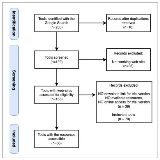 Conforming to the PRISMA guideline’s introduction section, we previously discussed the motivation and objectives of our review study (see Section 1). In this section, we first describe how we conducted the review according to the PRISMA method’s definitions. In Section 2.2, we give the search strategy. In Section 2.3, we give the eligibility criteria. In Section 2.4, we discuss the very first stage of the data collection process according to PRISMA specifications and define the set of features for which we collect data about the tools. Then, in Section 2.5, we explain how we keep the data sources for each tool and the protocol that we follow for analysing the data sources. We also discuss in Section 2.5 the risk of any biases due to the different reviewers contributing to the data collection process. Lastly, in Section 2.6, we discuss how we synthesise the collected tool data for reaching interesting findings.