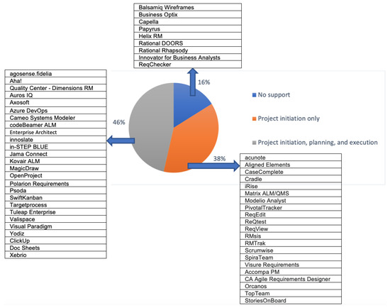 As shown in Figure 2, 46% of the requirements engineering tools support all the features of project management that are considered (i.e., project initiation, project planning, and project execution). A total of 38% of the tools just support the initiation phase of the project, which includes such activities as creating projects and assigning members to the project. However, those tools do not support planning the project tasks with, e.g., a Gantt chart, and the execution stage. A total of 16% of the tools do not provide built-in support for project management. Note that those tools with no built-in support may provide integration with project management tools such as Jira5.