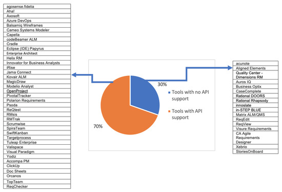 Concerning the API support, 70% of the requirements engineering tools offer an API for the users to extend the tools with specific features. Those tools provide websites that guide the user on how to use the API and perform any extensions. Figure 4 shows the tools that offer APIs and those that do not.
