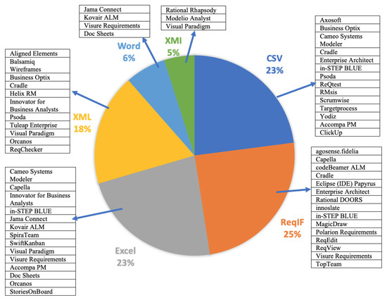 Most of the requirements engineering tools (89%) import requirements in different data formats. The top-supported data formats are Excel (32%), CSV (31%), and Word (20%), which are followed by other formats, including XML, XMI, Json, and PDF. Figure 5 shows the tools that support the different data formats for importing requirements.