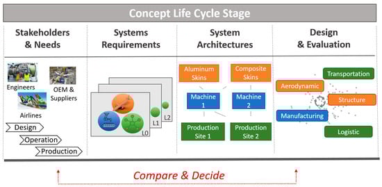 The steps of the methodology shown in Figure 3 have been implemented in the AGILE 4.0 framework [34], extended, and applied to the aircraft, manufacturing, and supply-chain systems, as shown in Figure 3. Therefore, the tools and technologies of this framework allow the implementation of stakeholders’ needs and requirements of three systems, the definition of criteria important for decision-makers, the creation of the system architectures, and the evaluation of them to generate the design space [35,36].