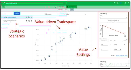 VALORISE is an in-house value-based dashboard developed to support and automatize the multi-criteria decision-making process. It is used to automatize the decision-making process and easily identify the best solution on the Pareto front by trading multiple decision-makers’ expectations. VALORISE supports decision-makers in modeling their expectations, analyzing real-time strategic scenarios by prioritizing criteria, and easily exploring the value-driven trade space for best-solution identification. Having a tool supporting decision-makers in the elicitation of the utility functions is key when applying the value-model theory. With VALORISE, decision-makers could easily draw their own utility functions and explore scenarios of interest by themselves, easily changing the weights associated with attributes. This allows decision-makers to perform uncertainty propagation analysis and, therefore, identify the most robust solution, i.e., the alternative whose value is almost constant in all the strategic scenarios of interest. Decision-makers can decide whether to select the best solution for a specific strategic scenario or the robust solution with a lower value in a specific scenario but whose oscillation in value is relatively small in all the strategic scenarios [7,42].