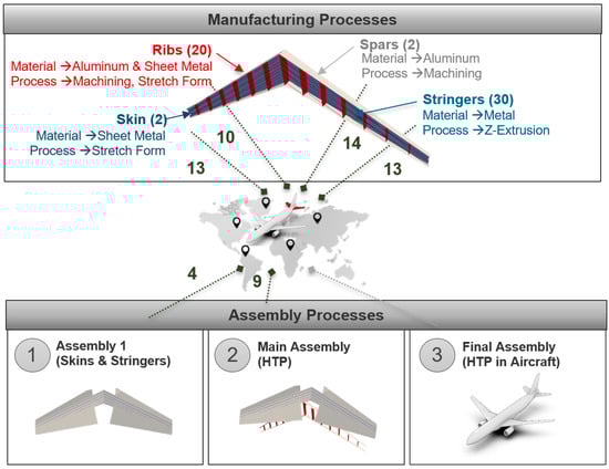The baseline for the application case is the horizontal tail plane of a 90-passenger aircraft, mainly made of aluminum [39]. To simplify the problem and reduce the number of alternatives populating the design space, this HTP configuration is assumed to be fixed in terms of materials and process. The materials, manufacturing, and assembly processes characterizing the horizontal tail plane components are shown in Figure 5.