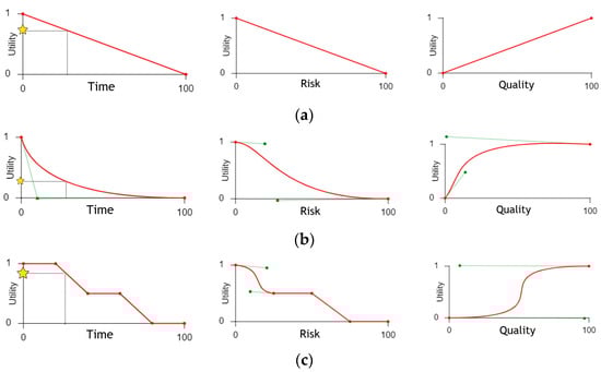 Linear utility functions, in the first row of Figure 6, are included in the case study since they are used to create a reference value-driven trade space uninfluenced by decision-makers. Attribute contents are normalized (0 to 100) due to the intellectual properties of the industrial partners involved in the application case. In the case of linear functions, utilities do not represent decision-maker preferences, but they can be read as analytical functions that can be used to translate different parameters with different scales of measurement in the same dimensionless ones for correct comparison. In this case, the solution with the highest value might not be the best solution for decision-makers since decision-maker expectations have not been considered yet.