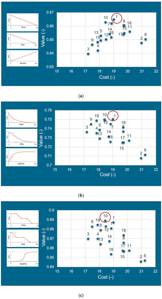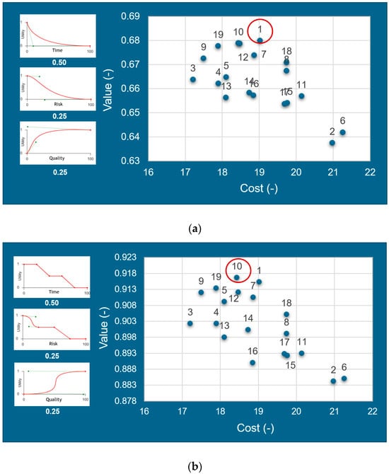The solution with the highest value highlighted in the reference case is the best analytical solution since decision-makers’ expectations are not implemented, as explained in Section 3.1. This solution turns out to be the best one for Decision-Maker A but not for Decision-Maker B. Implementing utility functions is, therefore, essential for the identification of the best solution that matches the decision-makers’ expectations. Indeed, the best solution for Decision-Makers A and B, i.e., the one with the highest value in the value-driven trade-spaces, is different, being, respectively, Solutions 1 and 10, as highlighted by the red circles in Figure 7b,c. The reason for this lies in the different utilities that decision-makers assign to attributes and, thus, to the different ways of making decisions. These best solutions correspond to supply chains matching decision-makers’ expectations in terms of risk, time, and quality since these are the attributes aggregated in value.
