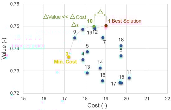 The solutions highlighted in Figure 9 are Solutions 1 and 10, which have already been introduced, and Solution 3. Looking at the value-driven Pareto front (the dashed line in Figure 9), these solutions might be of interest to Decision-Maker A because they, respectively, represent: