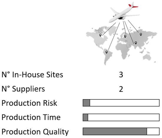 The production performance of Supply Chain 3 is instead reported in Figure 10. This supply chain has a higher production risk and time and a lower quality if compared to Supply Chains 1 and 10. This is, once again, mainly related to the competencies of the enterprises involved. In this specific case, however, the manufacturing of stringers is also outsourced to suppliers. In addition, the cost associated with this supply chain is lower than those of Supply Chains 1 and 10. The motivation relies on the competencies of enterprises since low competencies lead to low cost, but also to transportation. In fact, in Supply Chain 3, most of the components are transported by water, which reduces the transportation cost but increases the risk and time with a consequent decrease in value.
