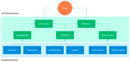 Flow is an autotelic experience, which refers to a self-contained activity that is done for a present reward without the anticipation of any future benefits [27]. The flow alienates one from reality to ecstasy without ruminating on the after-effects. A person in the state of flow has a boosted sense of self and concentration due to greater control, involvement, and enjoyment [28]. Awed by this experience, time is transformed, and the person is disconnected from his surroundings [29]. Consequently, this deep focus and enjoyment affect performance and its quality [30]. For a user to be in the state of flow, he must experience a sense of presence and immersion [31,32], which are directly affected by the quality of engagement, vividness, and interactivity [21].
