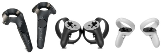 Current VR devices provide hand presence and interaction with the virtual world using wireless motion controllers and/or hand tracking. The handheld controllers have varied interactivity based on their designs. Figure 2 illustrates controllers for popular VR systems. These controllers are ergonomically designed to enable users to realistically interact with the VR environment. VR controllers have traditional action buttons and analog triggers, as found in many gaming controllers. Thumb sticks are provided for movement/locomotion, and internal motors are used for haptic feedback. These controllers track their position and send the data to the HMD to detect user hand movements and interactions. They can be programmed for several types of interactions, such as grab, pinch, poke, etc. These controllers provide a high degree of interaction fidelity and have a minimal temporal offset between real and virtual actions [40]. Hand tracking is also enabled in the current state-of-the-art VR systems. Instead of motion controllers, the user’s real hands are tracked by the cameras/sensors attached to the HMD and rendered in the virtual world. Users can use natural hand movements and gestures for interaction in VR. Regarding the controller, designing and implementing real hand interactions and gestures may be challenging. Errors in position tracking and gestures can also occur when hands are not visible or angled awkwardly to the HMD’s camera/sensors [41]. A high temporal offset between real and virtual actions can be experienced because the hand-tracking data is first processed by the HMD [42]. Several locomotion techniques are also possible in the current generation of VR systems and are divided into two categories: artificial locomotion and physical locomotion. Physical locomotion in VR is controlled by the user’s movements in the real world using the motion tracking of the HMD. Motion tracking of the HMD and controllers controls artificial locomotion. Examples are teleportation, walking in place, and world-pulling.