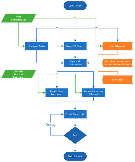 The artifacts of engagement and vividness were designed and organized in such a way that correlates with the cognitive differences and characteristics of nonliterate adult users. Elements of game-based learning were also incorporated, as it is considered an effective approach to transferring knowledge [55]. Wade et al. [56] found that prior knowledge-induced curiosity leads to higher learning. Therefore, we designed the game objects and environments following this concept while also considering the life experiences and sociocultural norms of nonliterate adults. Cognitive load is a major factor in increased error rates during a task based on gesture input [57]. Therefore, considering the lower visual-spatial skills of nonliterates, confined environments are designed for reduced cognitive load. Contemplating the lower language comprehension of nonliterates, easily comprehendible language was used to compose the audio instructions. Complements are considered positive emotion-laden word types [58], and positive emotions facilitate learning [59]; therefore, complementary remarks were also added. To invigorate an all-encompassing feeling, relaxing background music along with atmospheric sounds and effects were added. Language learning techniques were selected that can be effectively implemented in VR. Interaction schemes were programmed for both motion controllers and hand tracking. Only physical locomotion was used within a specified room-scale boundary to ponder VR sickness. Unintended accidents may occur while wearing the HMD, therefore, the real-world view was displayed on HMD screens using pass-through cameras upon crossing the virtual boundary. The prototype was thoroughly used and tested by expert VR users to find any bugs or exceptions. The final iteration was installed on the Oculus Quest 2 VR System. Figure 3 illustrates the level design process.