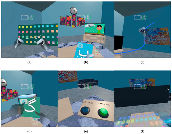 In the first level, the user was presented with an environment consisting of some basic game objects like small and large cupboards, a table, and a TV stand. Some electronics items, such as a TV and music system, were also placed. Everyday items were placed in such a way that the user required minimal locomotion to interact with them. Most of these items were grabbable, and some were pressable or usable. Some unrealistic objects based on real-world concepts were also placed in the environment, such as a floating TV remote with big buttons. The virtual environment and the interaction modes and possibilities are shown in Figure 4. In VR, spatial audio plays a vital role in affecting the sense of presence [60]. Therefore, several audio sources were placed in the environment to play music, ambiance sounds, interaction sounds, and instructions for the user.