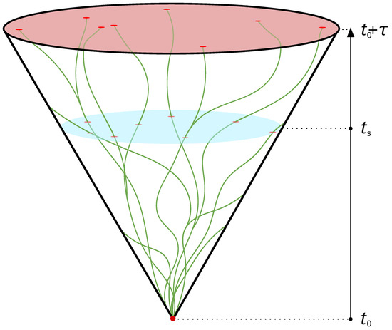 The agents in [31] made use of so-called “walkers”, which can be interpreted as particle representations of thought processes, i.e., virtual entities sent out to explore the future state space of an agent through a random walk [31,33,34]. Ref. [31] combined this idea of walkers with a mechanism for their (re-)distribution: thus, in contrast to CEF [30], it features the ability to introduce a utility function [31]. What had previously been a method to sample the future state space of the agent [34], also referred to as its causal cone (see Figure 1), was put into focus by [31].