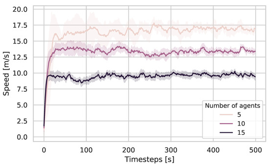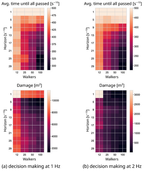 Another reason why other researchers, such as [32], discovered the collaboration of their agents could be due to the sequential evaluation of their agents’ decisions and high sample rates. As can be seen in Figure 3 and Figure 4, an increased number of decision steps improves the result: it, effectively, reduces the reaction time to the actions of other agents. Due to the sequential calculation, every agent has complete information about its surroundings. If the interval between the time steps is made small enough, the agents can effectively react to everything, and appear to be cooperative. Computationally, however, this is not feasible. A possible alternative would be to ensure a certain scanning density through a “dynamic horizon”. Once the walkers are too dispersed, the scanning is interrupted, and the intermediate result is used.