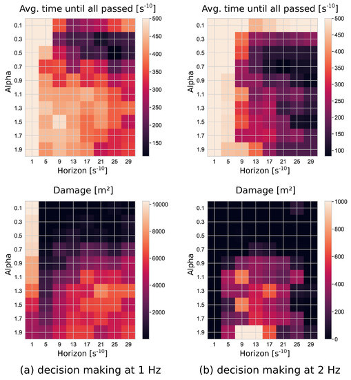 Thus far, only equivalent (homogeneous) agents have been considered. The small number of parameters compared to, for example, an artificial neural network or an accumulation of several rules would make it straightforward to define a heterogeneous population. In addition, the intuitive description of future state expectations also enables creating agents with specific beliefs. One of the future development directions could be the explicit integration of sleepiness, distraction, or aggression into the decision making process of the vehicle driver [46]: for example, reduced scanning density (considering fewer options) could be employed in case of sleepiness, or a decreased planning horizon, and tolerating more anticipated damage, to model aggression [54].