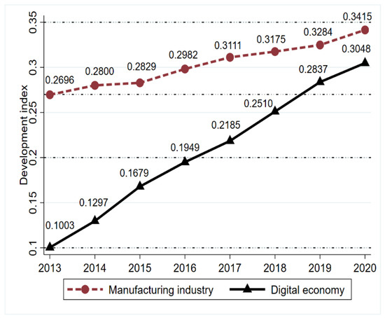 We measured the comprehensive index of digital economy and manufacturing industry development with the entropy weight method.