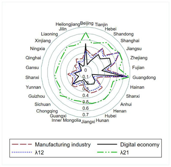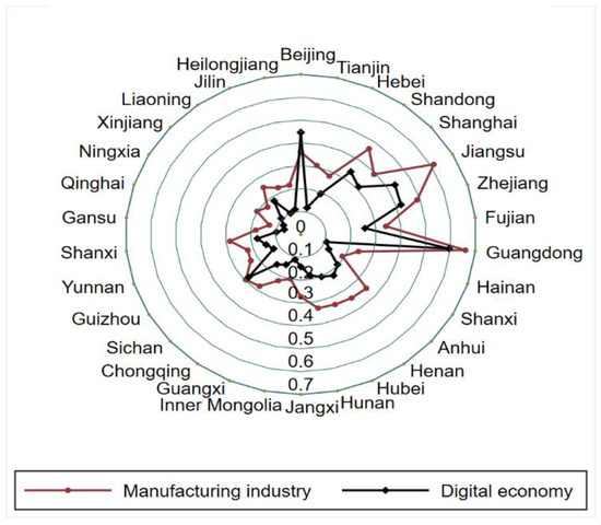 Figure 2 depicts the trend in the mean value of the comprehensive development index of the digital economy and manufacturing industry in the whole country. China’s digital economy started from a low point, but has rapidly developed. Compared with 2013, the index in 2020 increased by 203.8883%. China’s manufacturing industry has also maintained a growth trend, with an increase of 26.6691% in 2020 compared with 2013. The growth rate of the digital economy was much faster than that of the manufacturing industry, almost catching up with the manufacturing industry in 2020 [50]. Figure 3 depicts a radar chart of the annual mean value of the comprehensive development index of the digital economy and manufacturing industry in the sample provinces and municipalities. The two systems essentially grew with the same trend. Provinces and municipalities with high development levels and speed in the manufacturing industry performed equally well in the digital economy, and vice versa. This shows that the developments of the two are highly related [49].