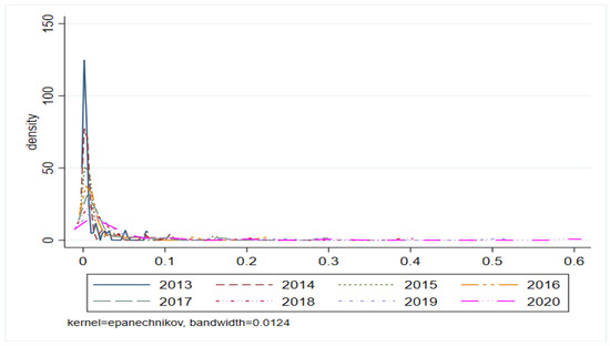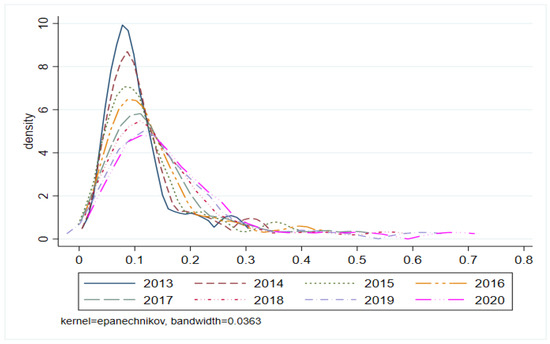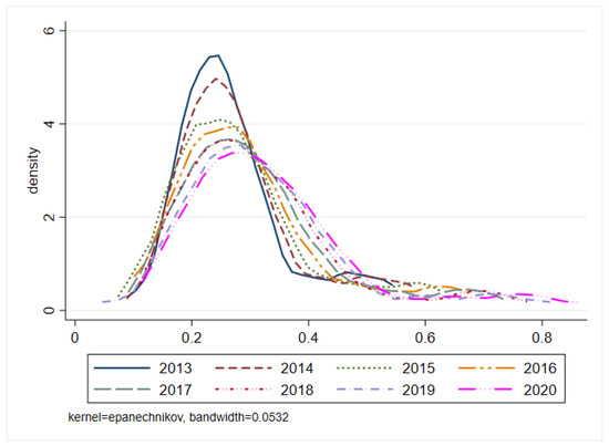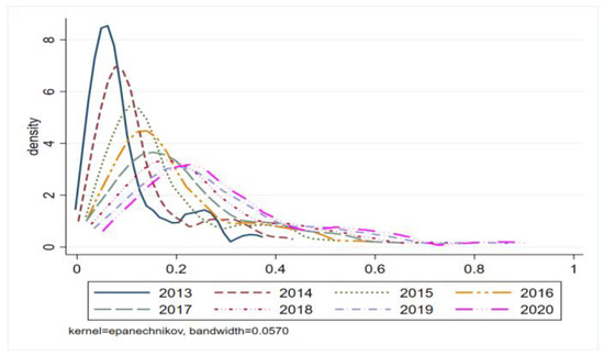 The kernel density of manufacturing industry development from 2013 to 2020.
