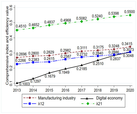We further discussed the above results based on economic realities. Among the four equilibrium points we obtained for the coevolution of the digital economy system and manufacturing system, is a zero-point solution, indicating that the digital economy and manufacturing industry have not yet developed, which is not in line with the situation in reality. The solution is a corner solution, indicating that the digital economy has fully developed while the manufacturing industry has not. is also a corner solution, indicating that the manufacturing industry has fully developed while the digital economy has not developed. The system evolution in this special situation does not align with the current reality of the digital economy and manufacturing industry. is an interior solution, which satisfies the condition for stability that and . It agrees with the characteristics in reality that the two systems promote each other and coevolve. Therefore, is a stable solution of the model. In such a case, the coupling coefficients of the two systems and are in a relatively balanced position. The coupling coefficient represents the synergy effect between the digital economy and manufacturing systems realized through elements sharing and technology spillovers. The product of and exactly expresses the direction of the coupled development of the two systems, and is in line with the theoretical analysis in this study. and are measurements of the coupling between the two systems [34], which can be calculated as follows: