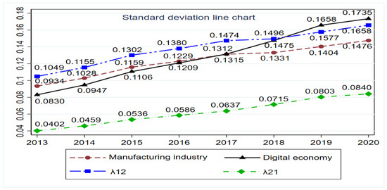 Figure 8 shows that the standard deviation curve of the comprehensive manufacturing index maintained a trend similar to that of , and the standard deviation of was larger than that of the comprehensive manufacturing index. This further showed that the level of manufacturing industry development affected . Moreover, the more developed the manufacturing industry, the more efficiently the digital economy was promoted. The standard deviation of in Figure 8 is much lower than that of , and lower than that of the comprehensive digital economy and manufacturing industry index. This further supported the results of the previous analysis. Regardless of whether the region was developed or developing in terms of the digital economy and manufacturing industry, the digital economy played a vital role in promoting the manufacturing industry, and the promotion efficiency in these regions was close to each other and was maintained at a relatively high level. The digital economy has been highly efficient, empowering, and inclusive in promoting manufacturing industry. These characteristics indicate that the digital economy is an economic form that is particularly suitable for coupled development with the manufacturing industry. Their coupled development can continuously improve the value-added capability of the two systems.