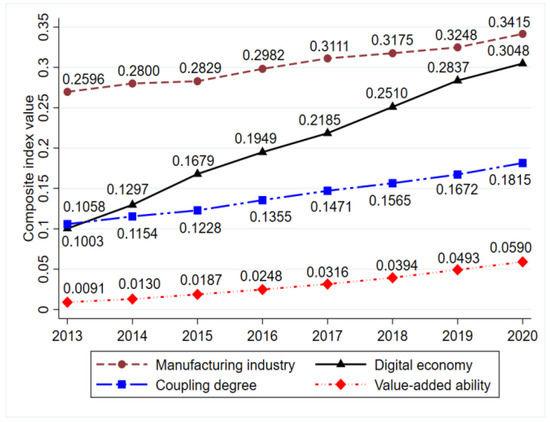 Dynamic trends in the coupling degree and the value-added capability of the manufacturing industry and the digital economy in China.
