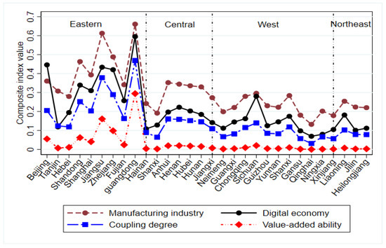 Figure 9 shows that the digital economy, manufacturing industry, and their coupling degree and value-added capability all continuously grew from 2013 to 2020. The manufacturing industry, its coupling with the digital economy, and its value-added capability show similar trends. The digital economy was rapidly improving between the lines of the coupling degree and manufacturing industry. This showed that, on the basis of the development of the manufacturing industry and driven by the digital economy, the two systems have achieved coupled growth and improvement in value-added capability. Figure 10 shows that the annual average values of the manufacturing industry, digital economy, and the coupling degree between them in the sample provinces and municipalities maintained a relatively similar growth pattern. However, only the eastern region had a value-added capability that grew following the growth pattern of the above-mentioned three factors, whereas the value-added capacity curves in the central, western, and northeast regions rapidly decrease and flatten out. This indicated that the digital economy and manufacturing industry have achieved coupled development to a certain extent, but the value-added capability of the two systems had not yet substantially improved. This is because the coupling between the two systems is a necessary condition and the threshold variable for a notable increase in the value-added capability of the two systems. Figure 10 shows that some provinces and municipalities had not yet crossed the threshold of coupling between the digital economy and manufacturing industry. Although some provinces and municipalities had crossed the threshold, they had not yet reached the goal of considerably increasing their value-added capability. Only some provinces and municipalities in the eastern region achieved the goal of substantially increasing their value-added capability after crossing the coupling threshold. In Figure 10, the four curves show consistent growth trends.