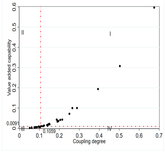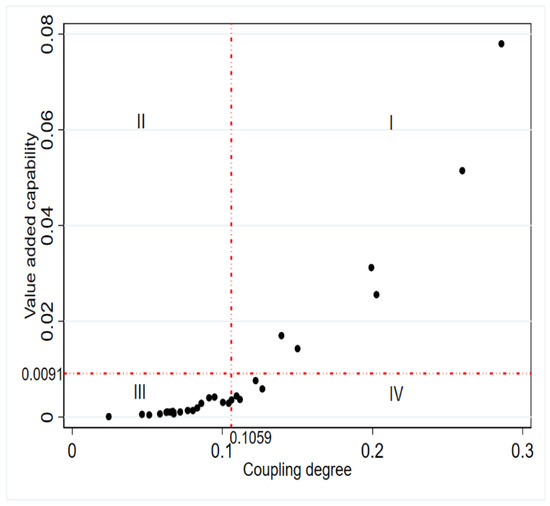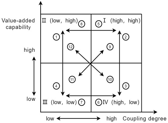 When the coupling coefficient , the two systems are completely coupled, and when , they are not fully coupled. Finally, according to Equations (6) and (10), we calculated the value-added capability of the two systems.