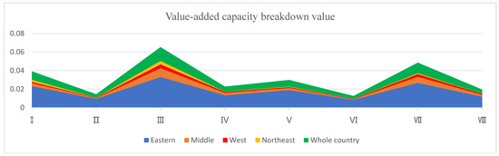 Table 7 shows that the average value-added capability of the coupled development of the digital economy and manufacturing industry in China increased from 0.0091 in 2013 to 0.0590 in 2020, which is an increase of 6.4835 times and an average annual growth rate of 30.8970%. The value-added capability of the digital economy and manufacturing industry was low in the beginning, but quickly grew. In further analyses of the different regions, we found that the annual average value-added capability of the eastern region was 0.0759, 0.0139 in the central region, 0.0056 in the western region, and 0.0046 in the northeast region. Only that of the eastern region exceeded the national average (0.0306). Moreover, the annual average of the eastern region was 5.4604 times higher than that of the central region, 13.5536 times higher than that of the western region, and 16.5 times higher than that of the northeast region. This indicated wide differences in the value-added capability of the two systems across the regions. Therefore, further studies are needed of the causes of the differences to identify the driving factors to improve the systems’ value-added capability.