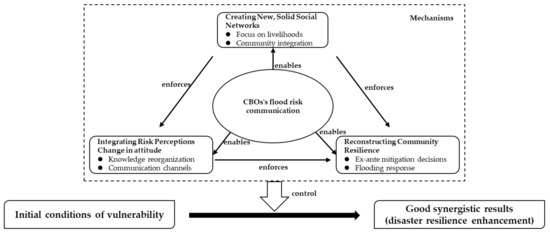 The study’s significant contribution is that it is a response to strengthening resilience in vulnerable populations. To address the absence of public disaster response capabilities, the early notion of public involvement centered on whole-of-society engagement in emergency management problems [69,72,73]. This paper expands this theory from emergency management to ex ante risk response, summarizing the essential concepts and mechanisms of flood risk communication in this setting. The findings support the basic theoretical principles that CBOs play a role in disaster mitigation acts such as trust, reciprocity, knowledge transmission, and decision-making.
