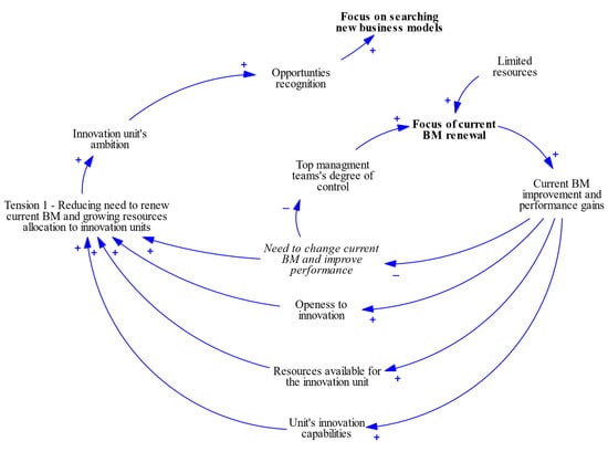 Therefore, in the literature and in practice, attempts are being made to uncover ways of overcoming such barriers and determine the most suitable organizational structure for pursuing lasting BM exploration that allows companies to seize “white spaces” [66] for business opportunities. Moreover, the relationship between BM renewal and exploration needs further clarification, especially considering the literature’s emphasis on both being vital for incumbents. This relationship can be either positive or negative. An excessive focus on BM renewal with an incremental goal, i.e., extrapolating from the current BM perspective, can hinder the ability to respond to discontinuities and constrain exploration [25,36]. The random exploration of new BMs can bring complexity, i.e., too many technological bases, high rates of cannibalization, and conflicts, leading to suboptimal BM management and consuming managerial attention [7]. Moreover, the challenges of generating relevant returns through new BMs [11] and the cognitive barriers relating a departure from the dominant logic [12,17,26] can induce barriers to exploratory BM, thus limiting future exploratory efforts. On the other hand, BM exploration is regarded as relevant to fostering experiments that can improve future envisioning, reduce dominant logic, and enhance BM renewal activity [3,7,8,36,63]. In this regard, the dynamics behind incumbent BMI and the relationship between BM renewal and BM exploration needs to be further studied. In particular, the balancing of renewal and exploration and the impacts of the various BMI types on each other remain understudied. To tackle these issues, we deployed systems thinking lens to better understand the dynamics behind incumbent BMI.
