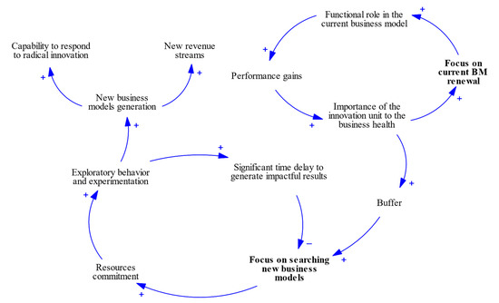 Exploring new BMs is an uncertain and time-consuming activity, from initiation until the new BMs provide relevant returns to the incumbents. The exploration of new BMs is also a resource-intensive activity. This is further exacerbated for incumbents, which need to sustain growth to satisfy their shareholders’ and stakeholders’ interests. In systemic terms, this means that the resources committed lead to a momentaneous increase in exploratory behavior and experimentation to create novel BMs. Given the time and learning curves, such activity might lead to the generation of new business models. However, on the other hand, the time delay associated with this activity in terms of years tends to suppress the activities by unbalancing the resource allocation towards incremental BM renewal, suppressing radical BM exploration.