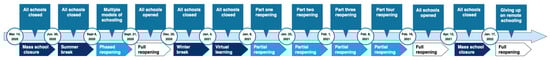 Ontario-level in-person school closures and reopening timeline. This figure is based on Gallagher et al. [12] licensed under CC BY 4.0 (https://creativecommons.org/licenses/by/4.0/).