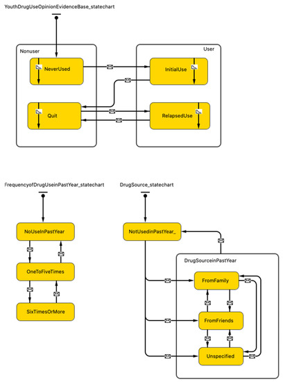 The use of agent-based modeling in this study supports the analysis of changes in the prevalence of nonmedical prescription opioid use among youth and the characterization of the effects of their peers, families, and socio-cultural environment. Hence, the model features three type of agents: youth, family, and socio-cultural environment. Youth behavior is governed by three different state charts depicted in Figure 2. These state charts collectively characterize the possible state-space for a single youth and the events that lead to transitions from one state to another.