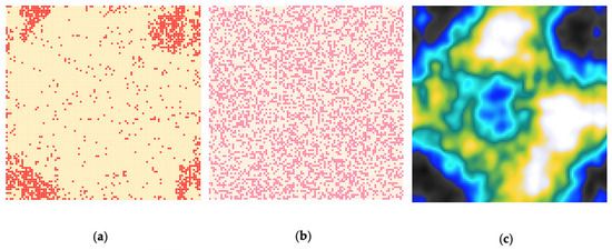 Three-level cellular automata—(a) Each patch presents a youth. Colors distinguish youth who are absent nonmedical prescription opioid use experience in the past year (yellow) and with nonmedical prescription opioid use experience in that interval (red). (b) Each patch represents family. Corresponding colors for a family with at least one member with current prescribed opioids and family without any prescribed opioids are pink and ivory, respectively. (c) Socio-cultural environment, in which the black areas represent a positive perspective toward drug use and gradations towards white represent successively more negative attitudes towards drug use.