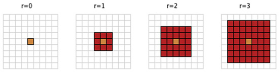 Moore neighborhood with different ranges from left to right: r = 0, r = 1, r = 2, and r = 3.