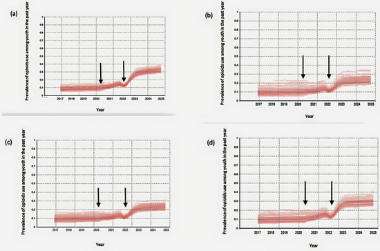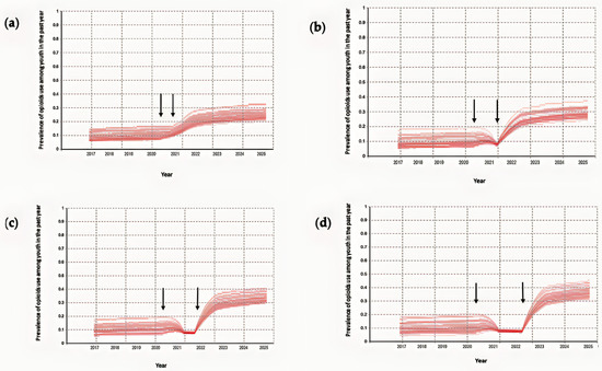 Figure 7 illustrates the impact of safely storing prescription opioids at home on the prevalence of youth with nonmedical prescription opioid use in the past year. Specifically, it shows the impacts when youth exposure to prescription opioids at home is reduced by 20%. Figure 7b illustrates a scenario in which the intervention of safely storing prescription opioids with a decrease of 20% in youth exposure to prescription opioids at home was implemented in 2017. Figure 7c depicts the effects of this intervention when it was implemented at the start of the COVID-19-related in-person school closures, while Figure 7d depicts the effects of the intervention of securely storing prescription opioids when it was implemented at the start of the 2022–2023 academic year. Cases in which this intervention was implemented before or early in the COVID-19-related in-person school closures slightly mitigate the extent of the increase in prevalence of drug use after the lifting of in-person school closures (Figure 7b,c). However, even a delayed implementation of safely storing prescription opioids—where such precautions are introduced after the lifting of the COVID-19-related in-person school closures—has also achieved a modest reduction in the peak in the prevalence of youth with nonmedical prescription opioid use (Figure 7d).