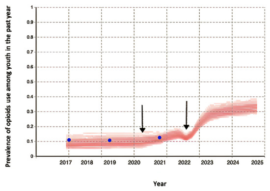 Model-generated prevalence of youth exhibiting nonmedical prescription opioid use in the past year based on Ontario school closure timeline. The blue dots show the empirical data and the two vertical black arrows represent the start and end of the Ontario school closure timeline.