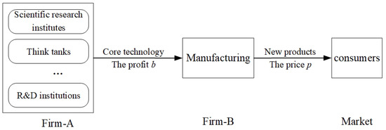 The knowledge subjects in the innovation alliance include not only firms that face the market directly, but also scientific research institutes, think tanks, and R&D institutions that provide knowledge services [23]. These knowledge service institutions can be regarded as “firms” in the innovation alliance. Knowledge service institutions play an important role in innovation alliances [24]. We regard the knowledge service institution in the innovation alliance as firm A and the firm that provides products to the market as firm B. Firm B needs to purchase core technologies from firm A to produce new products, such as patent authorization, software copyright authorization etc. We assume that firm B produces and sells a new product, and firm A obtains a profit b from it. Firm A determines the profit b based on factors such as its R&D cost, training cost, and the market price of the new product. Firm B designs and manufactures the new product after obtaining the technical support and knowledge resources of firm A. Firm B determines the price p of the new product according to the market demand, the manufacturing cost, logistics cost, and marketing effect. We show the game model in Figure 1. We list in Table 1 all the notation used throughout the paper.