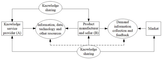 The flow of knowledge within innovation alliances is a complex dynamic process. Since knowledge is not a public resource of innovation alliances, the distribution of knowledge among various innovation subjects is irregular [35]. Knowledge sharing enables each subject to utilize the knowledge resources in the alliance as needed, which can maximize the value of knowledge. Given the rapid development of the market, the knowledge resources of firms are insufficient. Firms should make efficient use of the scale advantage of innovation alliances and continue to absorb knowledge from inside and outside the alliance to increase their market competitiveness [36]. This requires firms to participate in knowledge sharing between innovation alliance firms. With knowledge sharing, the market demand information on the new product will be effectively communicated to firm B. Firm B continues to transmit information to the cooperative firm A. Firm A receives and processes the information and transmits the feedback information and the core technology of the product after improvement according to the market demand to firm B. Firm B manufactures the new product that meets market expectations and sells it on the market. Firms incur some costs to participate in knowledge sharing, and the knowledge sharing cost is borne by firm A and firm B in the innovation alliance.