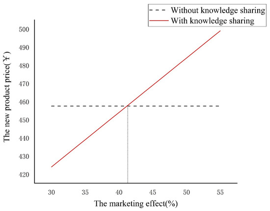 From Table 2, we see that with knowledge sharing the benefit of firm A increases by 9.6%, the benefit of firm B increases by 19.3%, and the innovation alliance cooperation benefit increases by 12.9%, which verifies Theorem 1. Consumers benefit from a 2.7% drop in the price of the new product, which verifies Theorem 2. In Table 2, the benefits of firm A and firm B with knowledge sharing are given by the Shapley value. The game is a convex cooperation game, and the Shapley value is in the core, which is a stable distribution method. This verifies Inference 1. In addition, both the firms and consumers benefit from knowledge sharing, which also means that the marketing effect with knowledge sharing does not exceed the upper limit in Theorem 3. At this point, the upper limit of the marketing effect is . Specifically, in this example, the changing trend of the new product price with the marketing effect with knowledge sharing is shown in Figure 3. It is seen that with knowledge sharing, the price of the new product is proportional to the marketing effect. The better the marketing effect is, the higher is the price of the new product. Moreover, when the marketing effect does not reach the upper limit , the new product price with knowledge sharing is lower than the new product price without knowledge sharing. At this point, the firm’s benefit increases, and consumers can buy the new product at a lower price. Both the firms and consumers benefit from knowledge sharing. After the marketing effect exceeds the upper limit , the new product price with knowledge sharing will be higher than the new product price without knowledge sharing. At this point, the firms will gain higher benefits, while the consumers will not, which verifies Theorem 3.