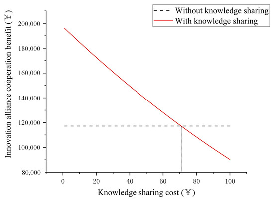 When the other parameters remain unchanged, the trend of the innovation alliance cooperation benefit with changing knowledge sharing cost is shown in Figure 4. When the knowledge sharing cost is less than , knowledge sharing between innovation alliance firms makes the knowledge elements circulate efficiently, and the economic benefit is improved. The benefit of the innovation alliance firms with knowledge sharing is significantly higher than that without knowledge sharing. When the knowledge sharing cost is higher than , the benefit of the innovation alliance firms decreases. At this time, the benefit of the innovation alliance firms with knowledge sharing will be lower than that without knowledge sharing. To prevent the leakage of core knowledge, firms will not share knowledge.