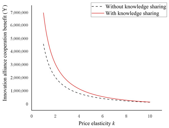 Figure 5 shows the trend of the innovation alliance cooperation benefit changing with price elasticity without and with knowledge sharing. Price elasticity affects the market demand for the new product. When the price elasticity is low, knowledge sharing has a significant impact on the innovation alliance cooperation benefit. At this time, the market demand for the new products is high, and the innovation alliance firms can obtain higher benefits. As price elasticity increases, the innovation alliance cooperation benefit brought about by knowledge sharing becomes less. At this time, the market demand for the new product decreases. Although the innovation alliance firms can still obtain benefit increases compared to those without knowledge sharing, the increases are small.