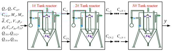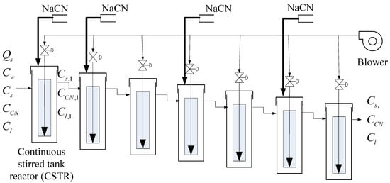 The leaching tank is serially connected by ore pulp overflow. The effective volume of each leaching tank is the same. It is assumed that the reactants in the leaching tank can be mixed adequately. Material isolation is neglected. The resistance of ore pulp is constant. The input and output schematic diagram of the cascade leaching system is shown in Figure 4. For the stable operation of the leaching industrial process, the mass conservation principle satisfies and . The total leaching rate of the cascaded gold cyanidation leaching system can be expressed as