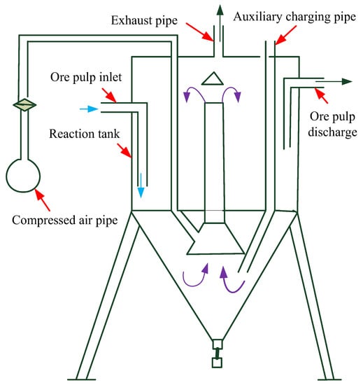 The continuous stirred leaching tank reactor (CSTR) is also called a Pachuca extractor and has been adopted in the leaching system [], as shown in Figure 2. The CSTR is the key reaction equipment in the leaching process. It is not only the reaction vessel but also the power source of the leaching process. The bottom of the leaching tank is filled with compressed air into the central pipe, forming a large number of bubbles rising along the central pipe. The bubble in the central pipe makes the volume of ore pulp expand and the density decrease, which results in the pulp pressure in the central pipe being less than the pressure outside the central pipe. Under the action of the pressure difference between the inside and outside of the pipe, the ore pulp in the pipe moves upward and flows out from the upper end of the central pipe. The ore pulp outside the central pipe slowly flows down to the bottom, which forms a closed circulation of pulp flow. The bubbles that overflow from the ore pulp are discharged through the exhaust pipe at the top of the tank.